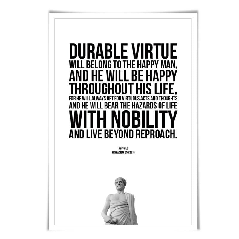 "Durable virtue will belong to the happy man, and he will be happy throughout his life, for he will always opt for virtuous acts and thoughts and he will bear the hazards of life with nobility and live beyond reproach." A wonderful typographic print with the thoughtful words of Artistotle. Perfect for classrooms, teachers, philosophers, historians, scholars, students and lovers of great academic wisdom...