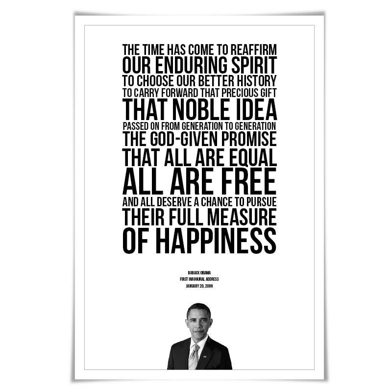 "... all are equal all are free and all deserve a chance to pursue their full measure of happiness." Taken from Barack Obama's first inaugural address on January 20, 2009. An inspiring presidential quote, presented with a bold text display. A wonderful quote that will be sure to inspire. Perfect for classrooms, teachers, historians, scholars, students and lovers of great oratory... Presented in crisp and vivid black and white. *