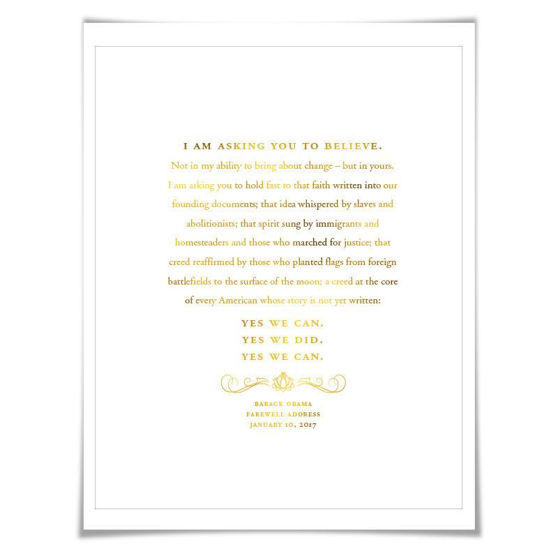 "... Yes We Can. Yes We Did. Yes We Can." Taken from Barack Obama's Farewell Address on January 10, 2017. An inspiring presidential quote filled with hope and a wonderful gold foil print. Perfect for classrooms, teachers, historians, scholars, students and lovers of great oratory... The artwork is 8 x 10 inches, indicated with a thin border, centred on an 8.5 x 11 inch sheet. ** You can choose from seven different foil colours: gold, silver, copper, rose gold, pale pink, hot pink and blue. Please see the second image for the different colours.