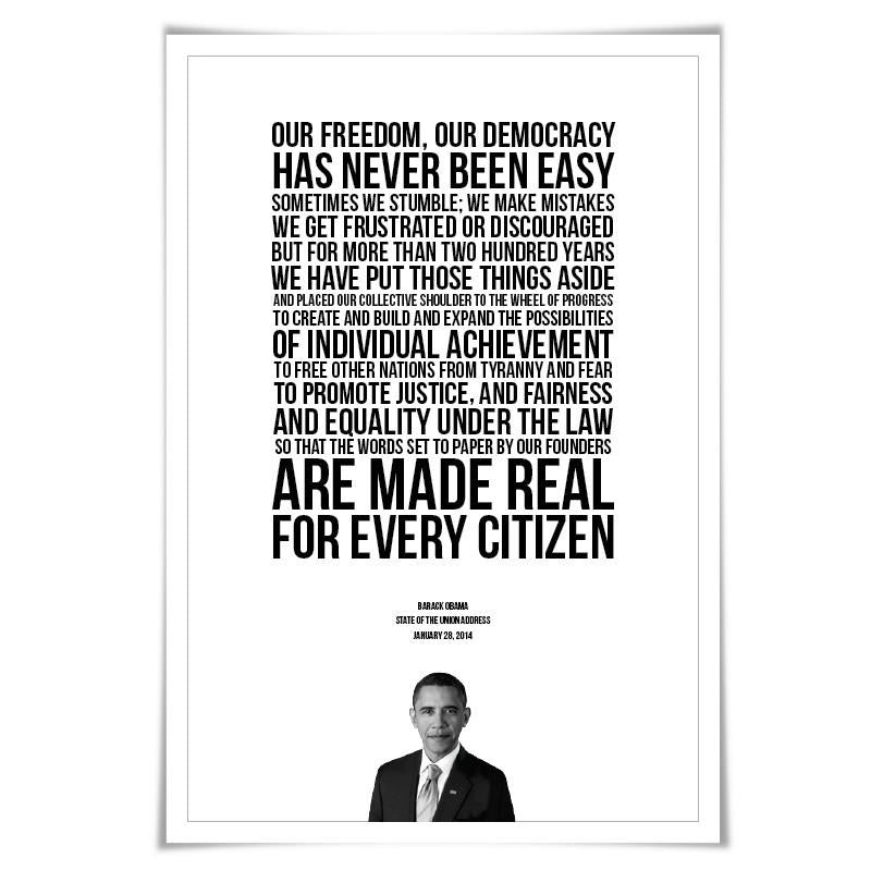 "Our freedom, our democracy, has never been easy..." Taken from Barack Obama's State of the Union Speech on January 28, 2014. An inspiring presidential quote, presented in crisp and vivid black and white with a bold text display. A wonderful quote that will be sure to inspire. Perfect for classrooms, teachers, historians, scholars, students and lovers of great oratory... Presented in crisp and vivid black and white. *